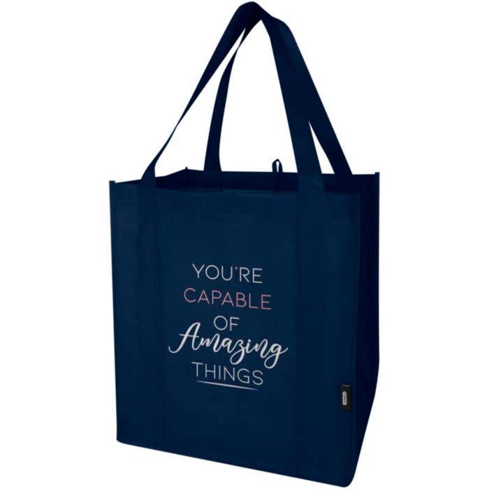De Liberty GRS gerecycled non woven draagtas is een duurzame boodschappentas die je kunt laten bedrukken met jouw bedrijfslogo. Deze milieuvriendelijke tas is gemaakt van scheurbestendig gerecycled RPET materiaal met GRS-certificering. Met een ruime inhoud van 29 liter en stevige bodemplaat is deze tas de ideale draagoplossing voor boodschappen, beurzen of promotionele doeleinden.
